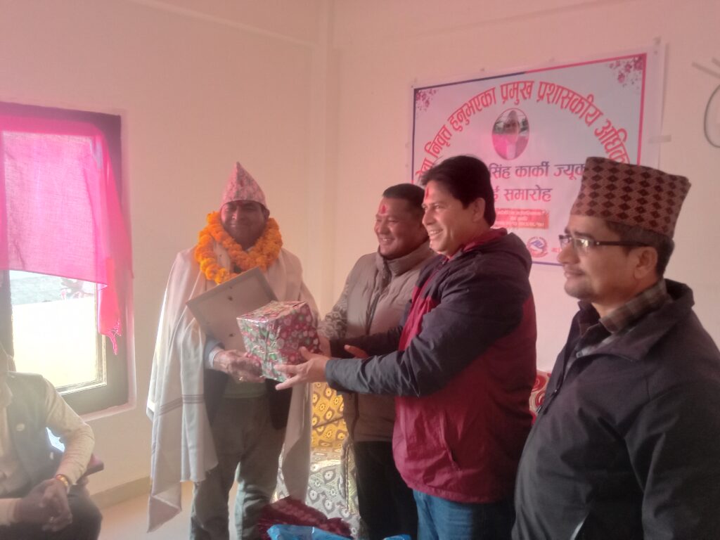 २०७५/०१/१३ देखि२०८०/७/१७ बर्दगोरिया गाउँपालिकामा प्रमुख प्रसाशकिय अधिकृतमा कार्यरत अर्जुन सिह कार्कीलाई गाउँपालिकाकाे तर्फबाट सम्मानपत्र,दाेसल्ला, मायाकाे चिनाेले सम्मान गर्दै आैपचारिक रूपमा बिदाई गरिएकाे थियाे ।