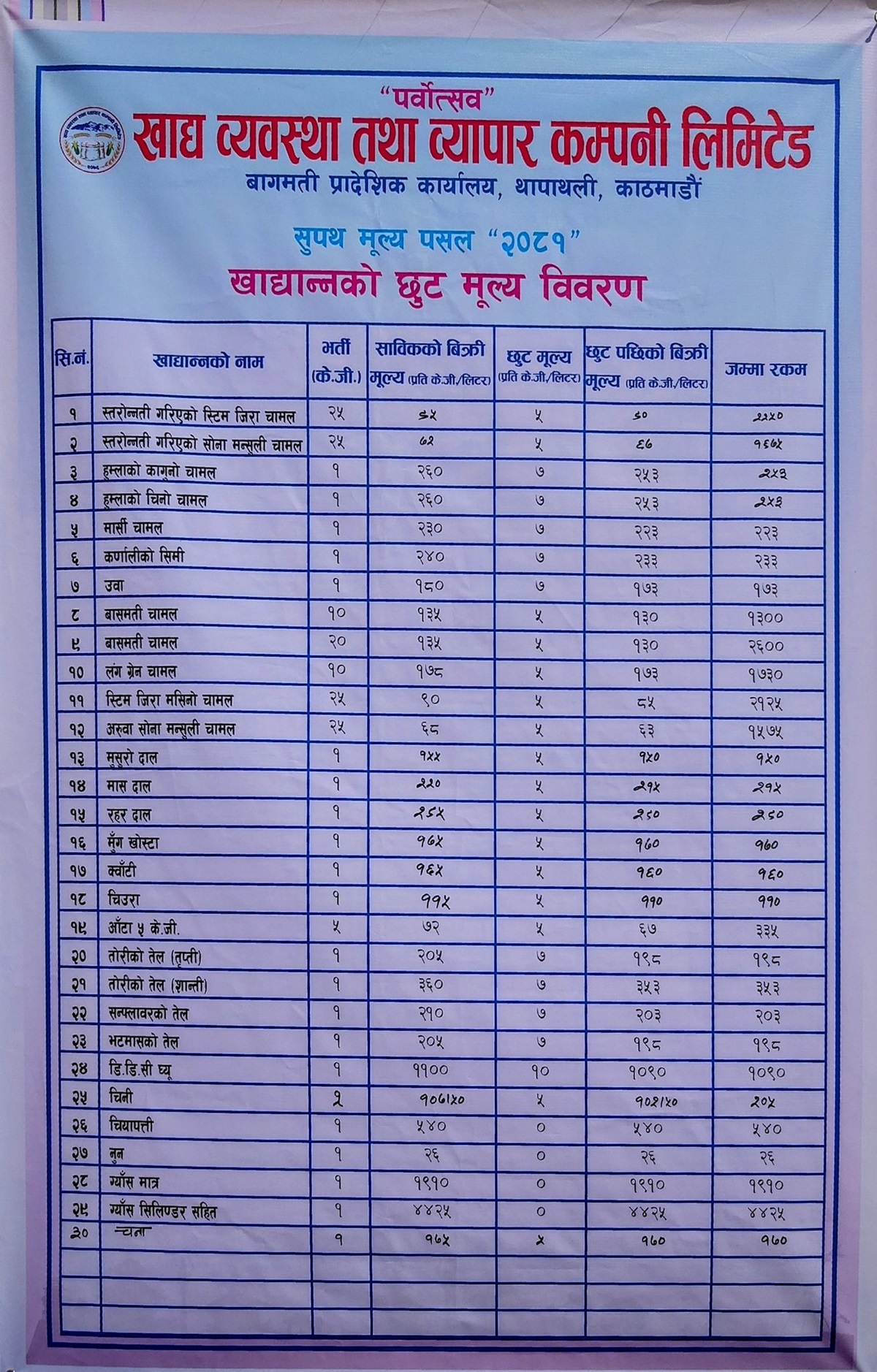 चामलमा प्रतिकिलो पाँच रूपैयाँदेखि सात रूपैयाँसम्म छुट दिइएको छ। कर्णालीको सिमीमा प्रतिकिलो सात रूपैयाँ छुट दिइएको छ। चिनीमा पाँच रूपैयाँ, खानेतेलमा सात रूपैयाँ र सबैभन्दा धेरै घ्यूमा प्रतिकिलो १० रूपैयाँ छुट दिइएको छ। त्यस्तै, चियापत्ती, नुन र ग्यासमा छुट दिइएको छैन।