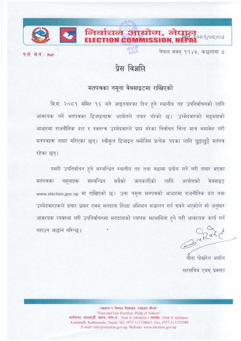 काठमाण्डौ । निर्वाचन आयोगले यहि मंसिर १६ गते हुने रिक्त पालिकाको उपचुनावका लागि आवश्यक पर्ने मतपत्रको नमुना ढाँचा तयार गरी सार्वजनिक गरेको छ ।