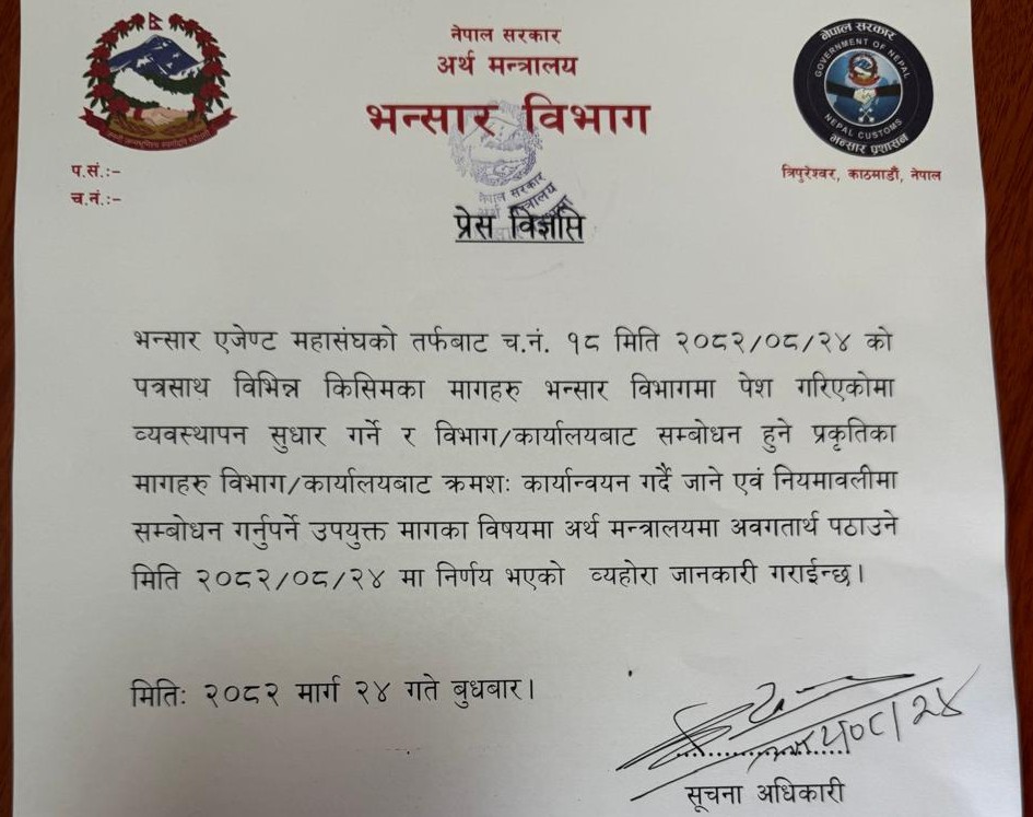 विभागले आजै प्रकाशन गरेको विज्ञप्तिमा भनिएको छ, ‘‘भन्सार एजेन्ट महासङ्घको तर्फबाट विभिन्न किसिमका मागहरू भन्सार विभागमा पेस गरिएकोमा व्यवस्थापन सुधार गर्ने र विभाग र कार्यालयबाट सम्बोधन हुने प्रकृतिका मागहरू विभाग र कार्यालयबाट क्रमशः कार्यान्वयन गर्दै जाने एवम् नियमावलीमा सम्बोधन गर्नुपर्ने उपयुक्त मागका विषयमा अर्थ मन्त्रालयमा अवगतार्थ पठाउने निर्णय भएको छ ।’’