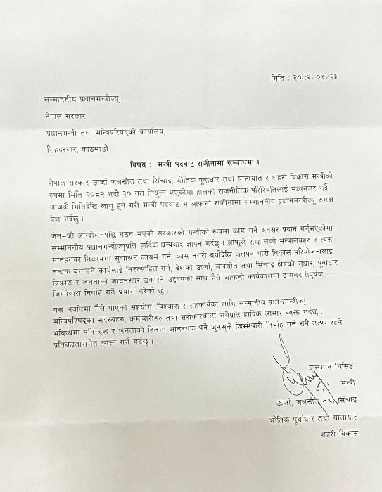 काठमाडौं । ऊर्जा, भौतिक तथा सहरी विकास मन्त्री कुलमान घिसिङले पदबाट राजीनामा दिएका छन् । उनले प्रधानमन्त्री सुशीला कार्कीलाई आजै राजीनामा बुझाएका हुन् ।