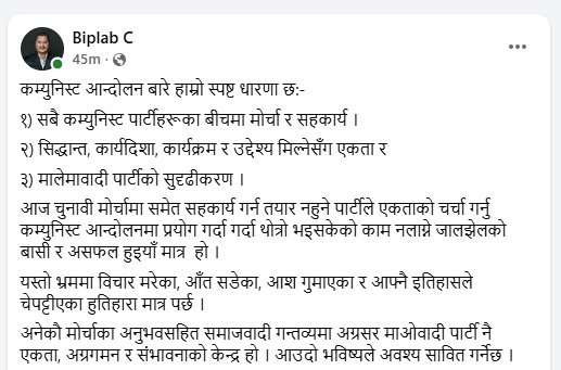 बुधबार नेकपा संयोजक पुष्पकमल दाहाल ‘प्रचण्ड’ले एकतामा आउन आग्रह गरेपछि त्यसको प्रतिक्रिया जनाउँदै विप्लवले चुनावी सहकार्य बिना एकताको चर्चा गर्नु व्यवहारिक नभएको  बताएका हुन् ।