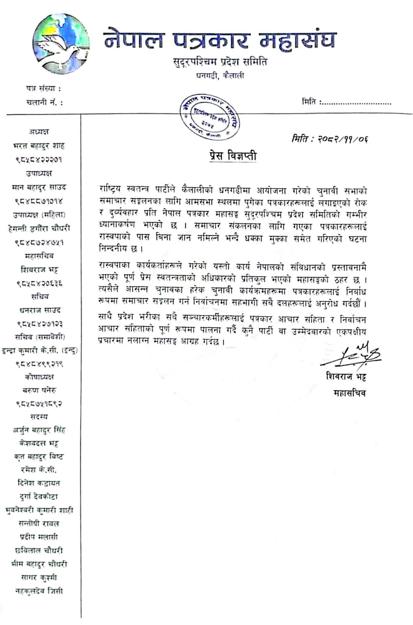 कैलाली । जिल्लाको धनगढीमा आयोजित राष्ट्रिय स्वतन्त्र पार्टी रास्वपा को चुनावी सभामा समाचार संकलनका लागि पुगेका पत्रकारहरूमाथि भएको दुर्व्यवहारप्रति नेपाल पत्रकार महासंघले कडा आपत्ति जनाएको छ । महासंघको सुदूरपश्चिम प्रदेश समितिले एक प्रेस विज्ञप्ति जारी गर्दै उक्त घटनाको घोर भर्त्सना गरेको हो।