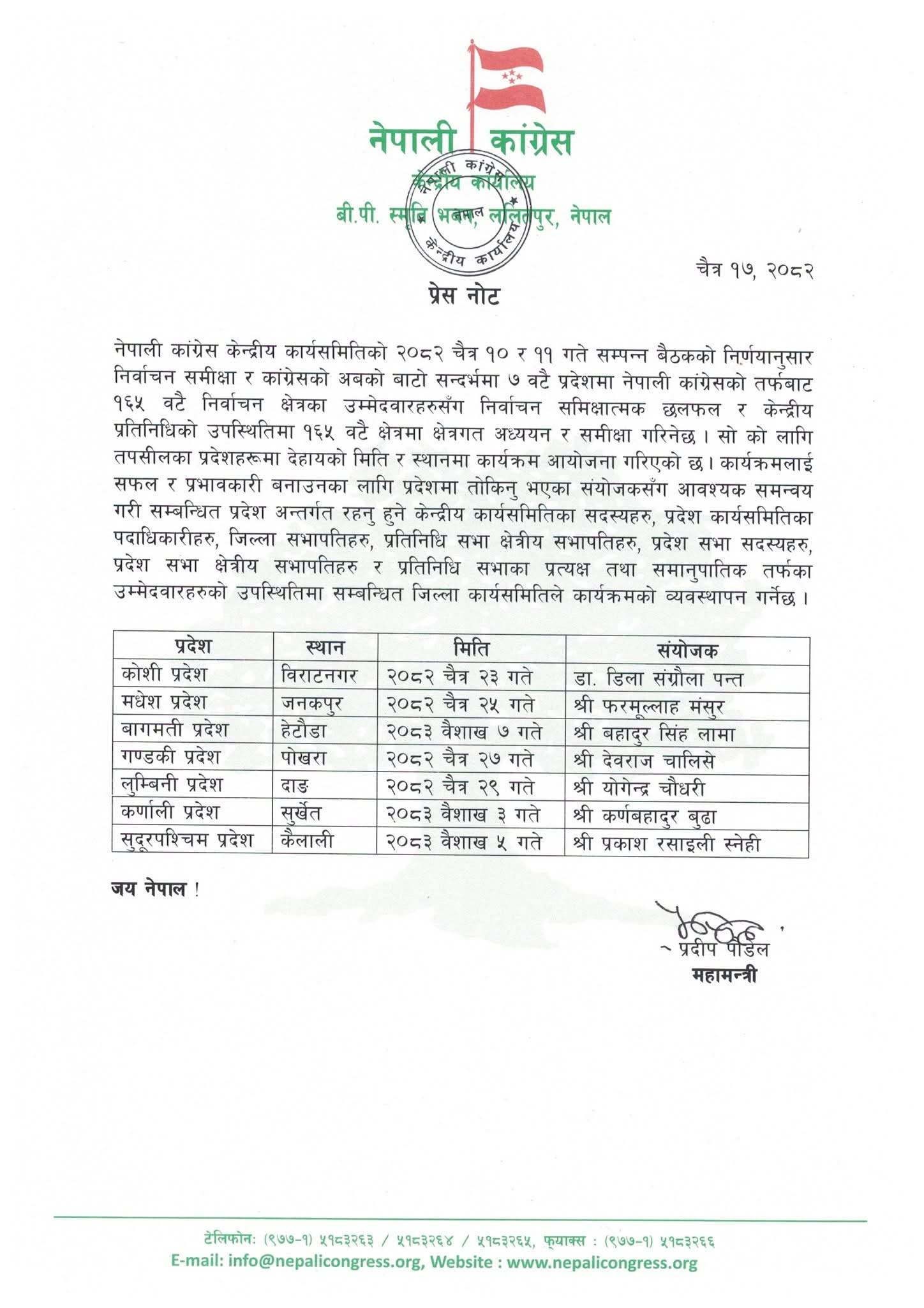 पार्टीले सातै प्रदेशका लागि छुट्टाछुट्टै मिति, स्थान र संयोजक समेत तोकेको छ । कोशी प्रदेशको विराटनगरमा चैत २३ गते डा. डिला संग्रौला पन्तको संयोजनमा कार्यक्रम हुनेछ भने मधेश प्रदेशको जनकपुरमा चैत २५ गते फरमूल्लाह मंसुरको संयोजनमा समीक्षा बैठक बस्नेछ ।
