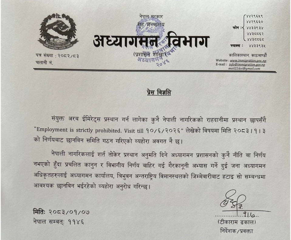 वैशाख ७ , काठमाडौँ । संयुक्त अरब इमिरेट्स (युएई) प्रस्थान गर्न लागेका नेपाली नागरिकको राहदानीमा गैरकानुनी रूपमा शर्त लेखेको पाइएपछि दुई जना अध्यागमन अधिकृतलाई जिम्मेवारीबाट हटाइएको छ।