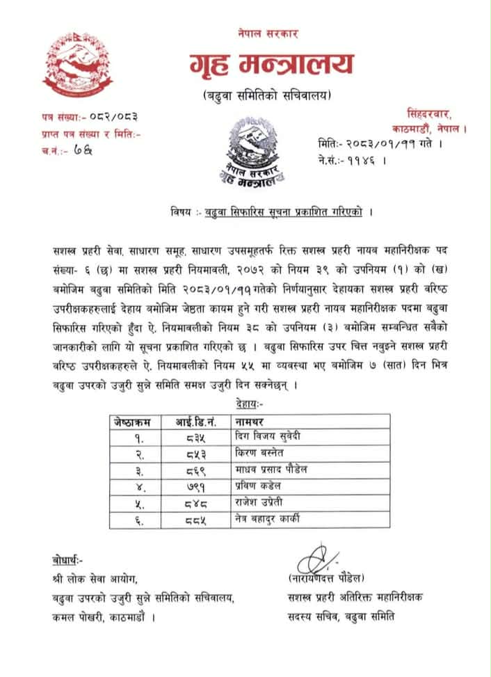 समितिले एसएसपीहरु दिगविजय सुवेदी, किरण बस्नेत, माधवप्रसाद पौडेल, प्रवीण कँडेल, राजेश उप्रेती र नेत्रबहादुर कार्कीलाई डीआईजीमा बढुवा सिफारिस गरेको हो ।